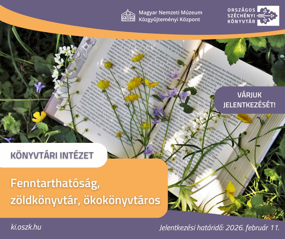 A Magyar Nemzeti Múzeum Közgyűjteményi Központ Országos Széchényi Könyvtár (felnőttképzési nyilvántartási szám: MNMKK B/2022/000258) meghirdeti 45 órás engedélyezett továbbképzési programját Fenntarthatóság, zöldkönyvtár, ökokönyvtáros (IV/2199-3/2025/KGYFO) címmel. A tanfolyamot a tervezett időpontban abban az esetben van lehetőségünk megvalósítani, ha a Kormányzati Képzésszervezési Központ 396/2023. (VIII. 24.) Korm. rendeletben előírt jóváhagyása megérkezik.