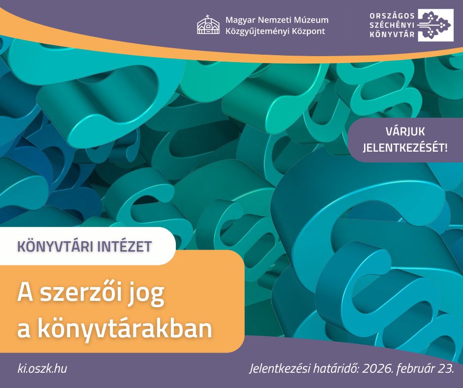 A Magyar Nemzeti Múzeum Közgyűjteményi Központ Országos Széchényi Könyvtár (felnőttképzési nyilvántartási szám: MNMKK B/2022/000258) meghirdeti 30 órás engedélyezett továbbképzési programját A szerzői jog a könyvtárakban (VI/4021-3/2021/KONYVLEV) címmel. A tanfolyamot a tervezett időpontban abban az esetben van lehetőségünk megvalósítani, ha a Kormányzati Képzésszervezési Központ 396/2023. (VIII. 24.) Korm. rendeletben előírt jóváhagyása megérkezik.