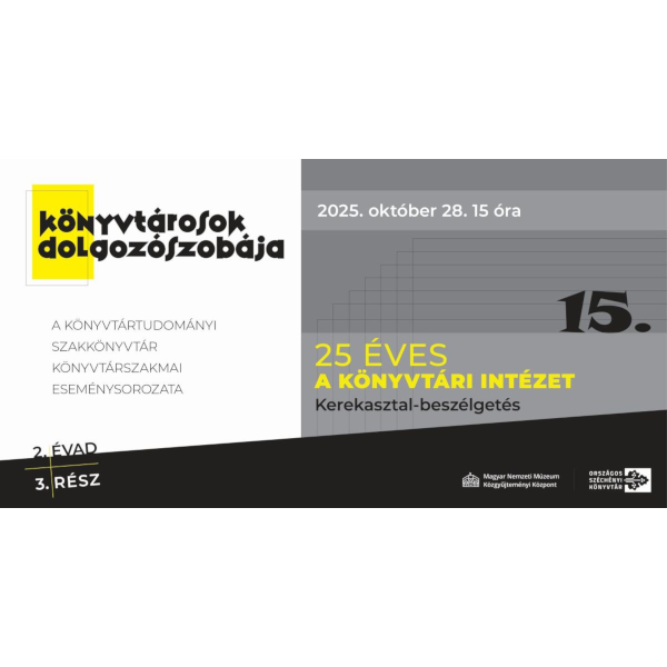 A Könyvtártudományi Szakkönyvtár 2025. október 28-án, kedden 15 órakor tartotta meg Könyvtárosok dolgozószobája elnevezésű könyvtárszakmai eseménysorozata tizenötödik rendezvényét 25 éves a Könyvtári Intézet címmel.