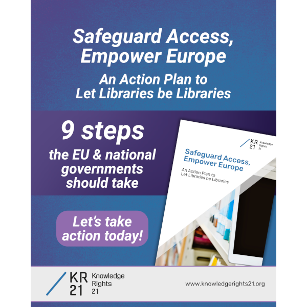 A Knowledge Rights 21 (KR21) 2026. február 19-én útjára indított egy határozott ütemtervet, a „Védjük meg a hozzáférést, erősítsük meg Európát – Cselekvési terv, hogy a könyvtárak könyvtárak maradhassanak” című dokumentumot. Ez a kutatásra és a nyílt tudományra összpontosító, „Cselekvési terv a tudásért egy erősebb Európában” című kiadvány testvérdokumentuma.