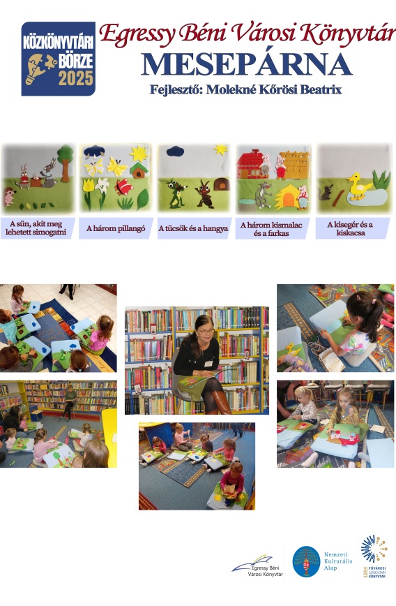 Mesepárna foglalkozásainkat három és hatéves kor közötti gyermekek részére terveztük, vagyis az óvodába járó gyerekeket céloztuk meg. Mivel napközben a kicsik az óvodában tartózkodnak, ezért délután fél öttől kívántuk megvalósítani ezen programjainkat. A délutáni időpont megkívánja, hogy a gyermek szülői kísérettel látogasson el a könyvtárba, így a szülő azonnal beleláthat, a könyvtár milyen típusú tevékenységet folytat annak érdekében, hogy gyermeke hasznos ismeretekhez jusson és jól érezze magát a könyvtárban. Mesepárnás foglalkozásainkkal a gyermekek saját maguk játszhatnak a mesefigurákkal. A mesehallgatással egyidőben a gyermekek interaktív módon vesznek részt a foglalkozáson. A gyermek részére fontos, hogy részese legyen az előadásnak. Módszerünkkel egy dinamikus, élményalapú programot kínálunk. Kicsi korban nagyon fontos, hogy a gyermek tapintással is érzékelhesse az elhangzó mesét. A három évet betöltött gyermekek már képesek jobban odafigyelni arra, amit hallgatnak, így folyamatosan nyomon tudják követni a történet előrehaladását. Ahhoz azonban, hogy kellően megismerkedjenek a mesefigurákkal, a foglalkozás elején együtt meg kell nézegetni velük a szereplőket, és elmondani, mi az, amit nekik kell majd megtenni. Első alkalommal egy nagyon ismert mesét választottunk, A három kismalac címűt. Örömmel tapasztaltuk, hogy abban a pillanatban, ahogy előkerültek a kis tarisznyákból a figurák, a gyermekek fel is ismerték a mesét. Könyvtárosaink saját maguk készítik el a mesepárnát, mely egy kb. 40x40 cm-es darab, egy-egy mese szereplői filcanyagból készülnek. Mivel a párnák huzata szintén hasonló anyagból készül, ezért a figurák önmaguktól tapadnak a párnára. A foglalkozás menetét tekintve, könyvtárosok olvassák a mesét, miközben a gyerekek a síkbábokat rakosgathatják a párnára. A könyvből való felolvasás mintegy demonstrálja a résztvevők számára, hogyan kell használni egy könyvet, és hogyan zajlik az olvasás. A foglalkozás fejleszti a gyermekek finommotorikus mozgását, a fantáziáját, segít a kommunikációban, növeli szókincsüket.