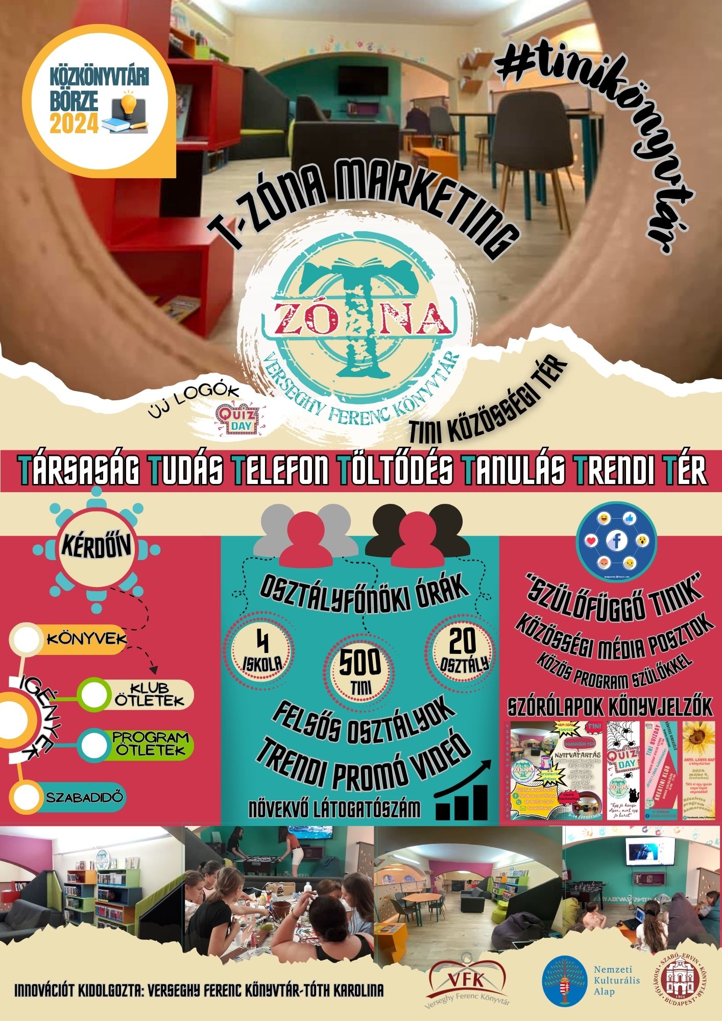 Bemutatjuk a Verseghy Könyvtár legújabb tini közösségi terét, a T-zónát, amit a 9-14 éves korosztály számára alakítottunk ki, illetve a T-zóna marketing tevékenységét és újszerű, iskolákban tartott népszerűsítő kampányunkat, aminek pozitív hatása, hogy ezekből az iskolákból megjelennek a diákok a könyvtárban, tanulnak, beszélgetnek, játszanak. Marketing elemeink: igényfelmérés, új logó, szülők megnyerése, közösségi médiafelületek használata, T-zóna projekt iskolákban.
