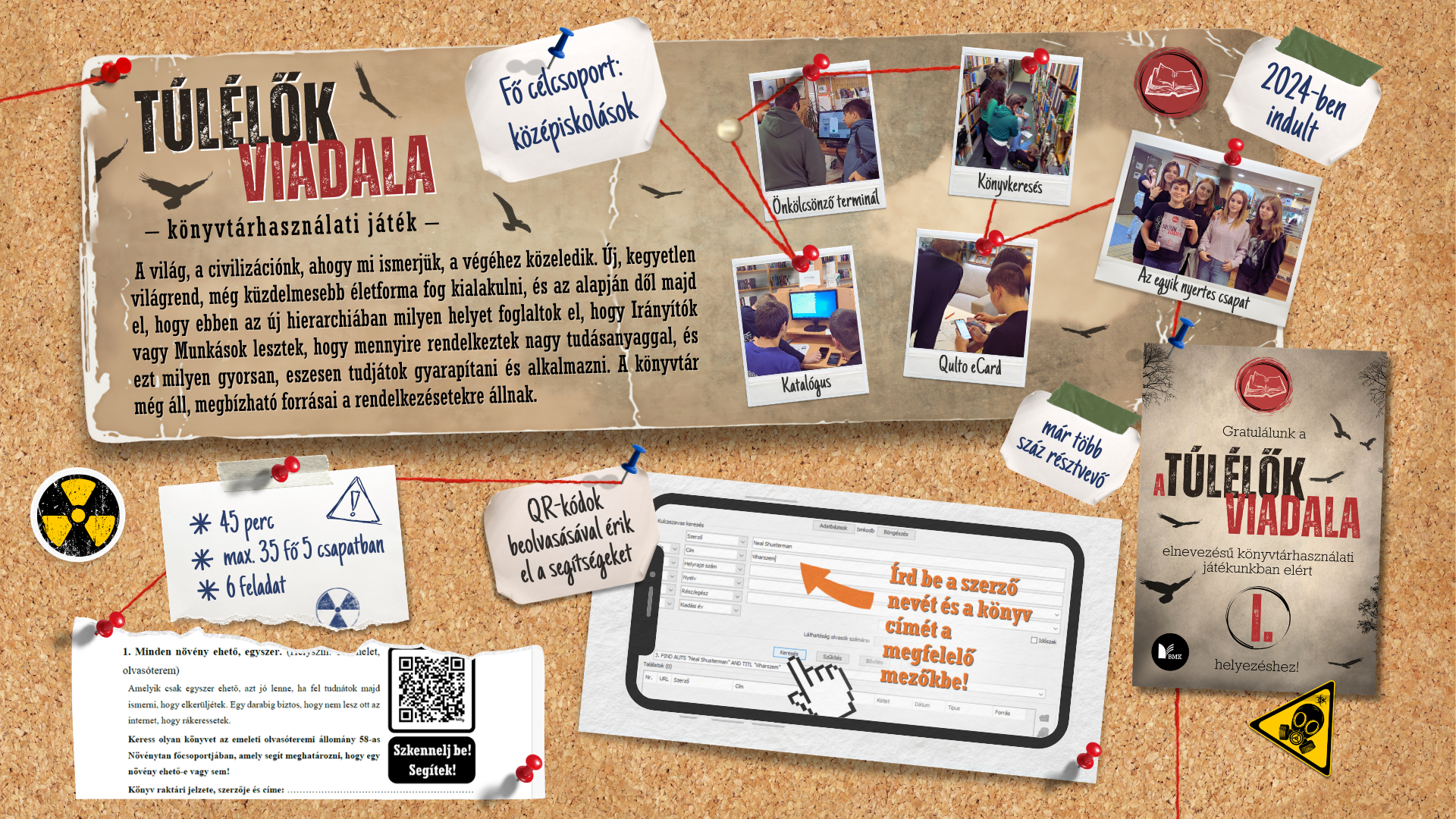 A Túlélők viadala elnevezésű könyvtárhasználati játékban a feladatok látszatra egy a "világvége" utáni életre készítik fel a résztvevőket. Valójában könyveket, információt keresnek, könyvtári eszközök használatával, könyvtári terekkel és gyűjteményekkel ismerkednek. Csapatokban, önjáró módon vetélkednek egymás ellen a diákok. Minden szükséges információjuk adott a kiosztott feladatlapokon; QR-kódok beolvasásával részletes segítségeket is elérnek.