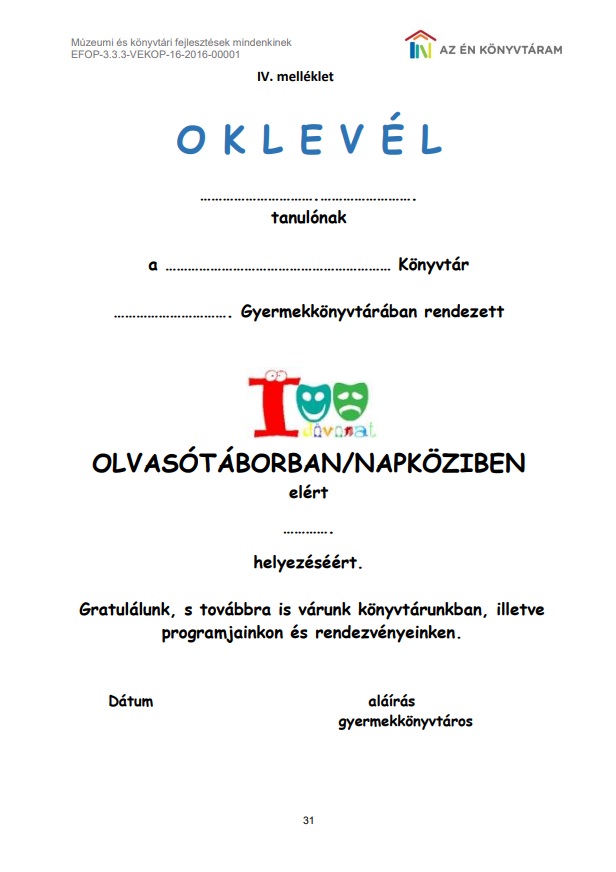 Idővonat olvasótábor. In: FEHÉR Judit – KOGLERNÉ HERNÁDI Ágnes (szerk.): Olvasásfejlesztő könyvtári mintaprogramok. Módszertani kötetek 7. „Az én könyvtáram”. Bp.: FSZEK, 2019. 243–252. p. Fejlesztő: dr. Szabolcsiné Orosz Hajnalka